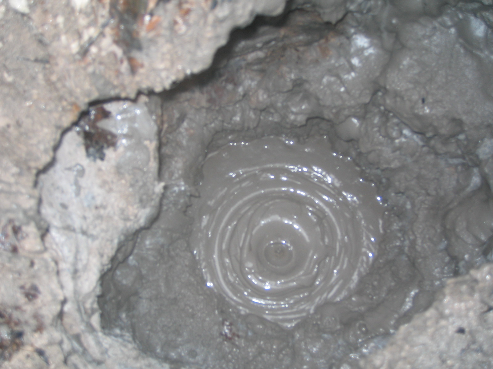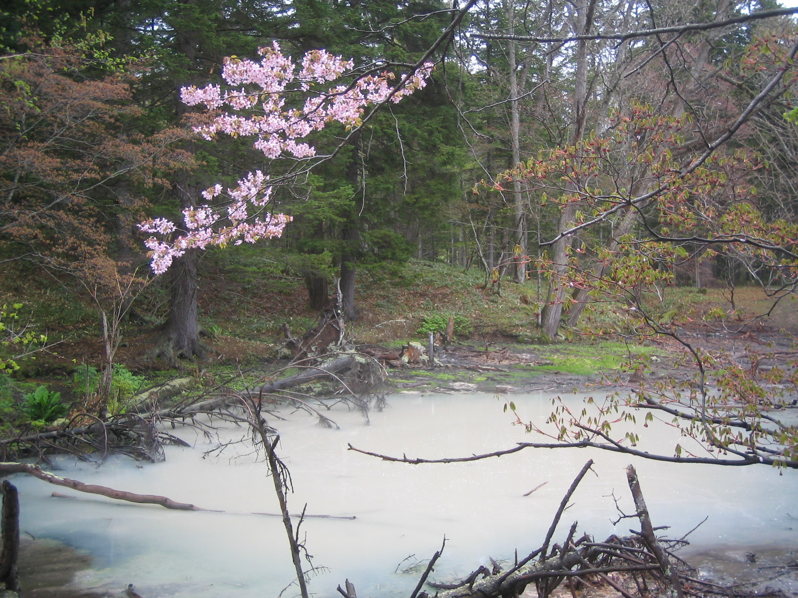 手塚沼と呼ばれる乳白色の沼は温泉が湧出しているのか「ボッケ」と呼ばれる灰色の泥壺からボコボコと蒸気が立っている。