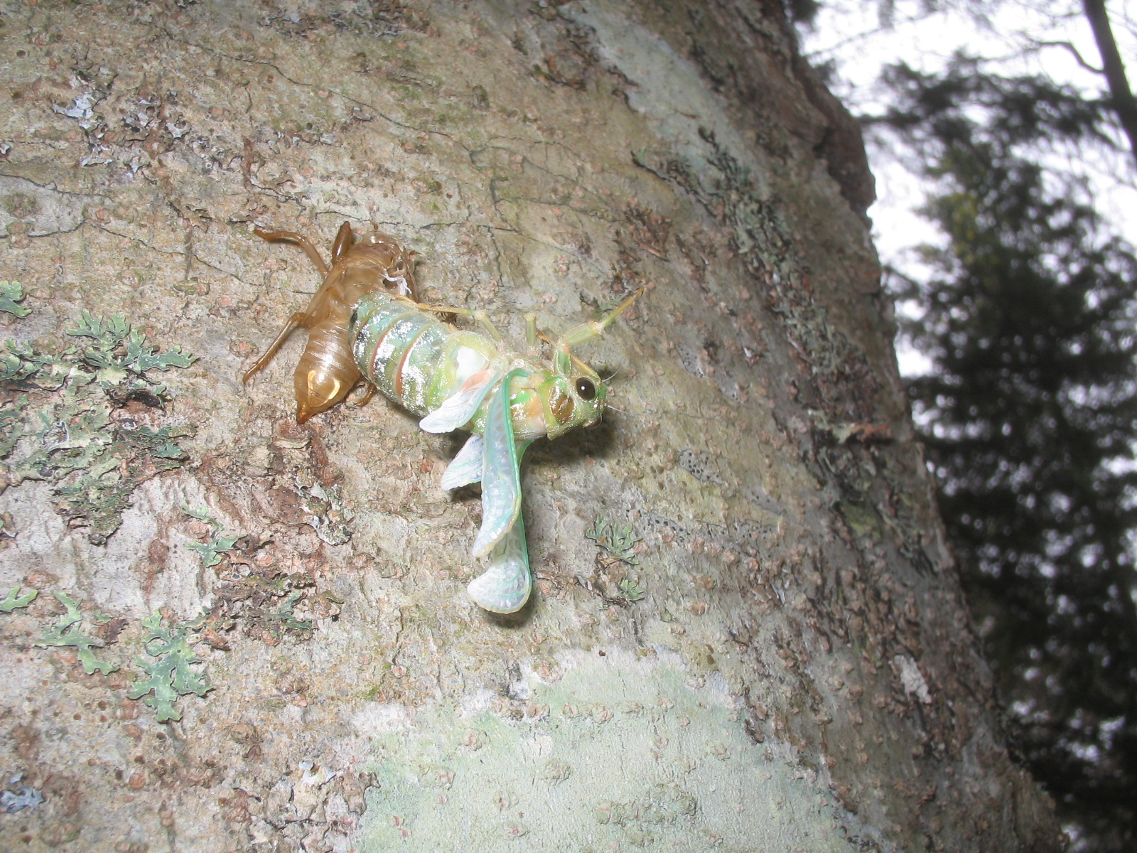さらに進むと、「見てみて!」ガイドさんの興奮した声に振り返ると、それはなんとセミの羽化の瞬間。